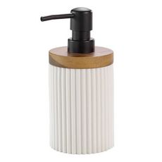 Informations Techniques : Dimensions : D. 8 x H. 17 cm Matières : Polyrésine & Bois (Acacia) Spécificités : Pratique & Moderne Distributeur de savon Design strié Vendu à l'unité Poids : 0,39 kg Couleur : Blanc