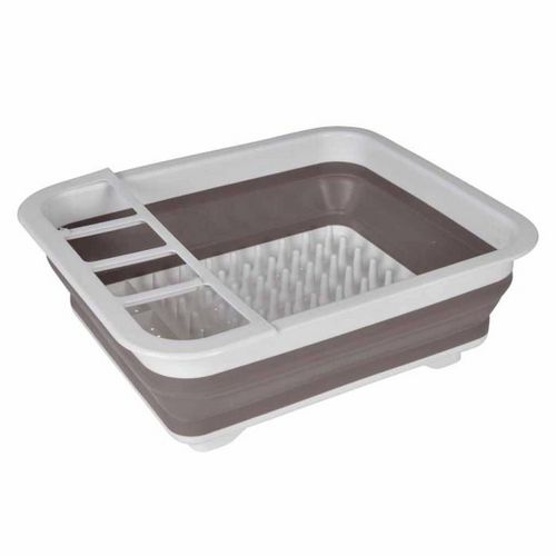 Informations Techniques : Dimensions : L. 36,5 x l. 31,5 x H. 13 cm Matière : Plastique Spécificités : Pratique & Tendance Egouttoir à Vaisselle Rétractable Contenance : 37 L Couleur : Taupe & Blanc