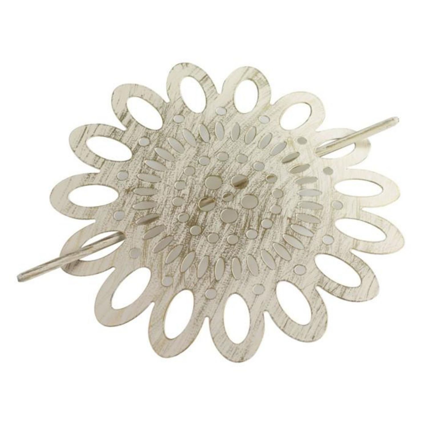Informations Techniques : Dimensions : D. 17,5 cm Matière : 100% Fer Spécificités : Design & Pratique En forme de fleur Patinée Simple d'utilisation Poids : 0,084 kg Couleur : Blanc & Or