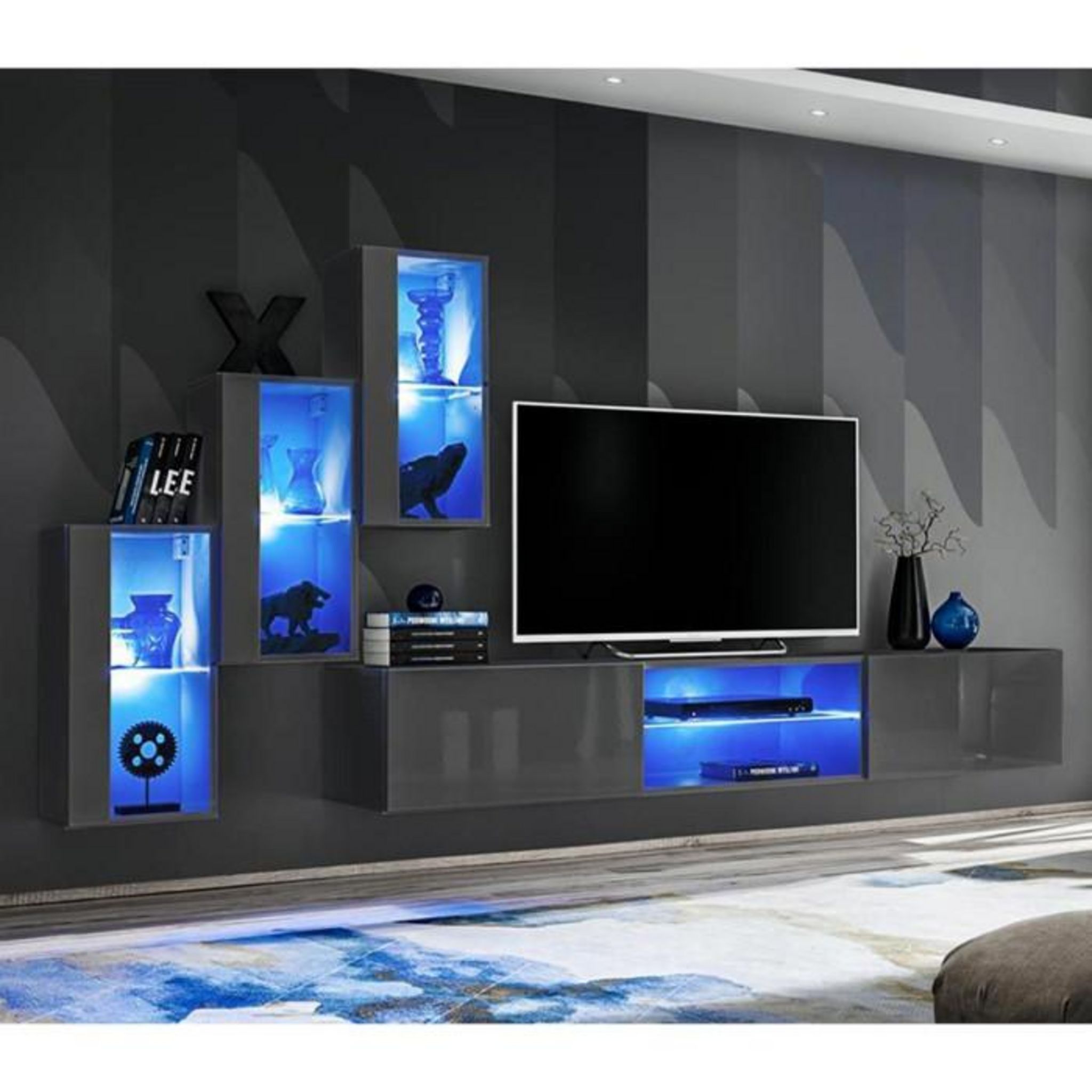 Informations Techniques : Dimensions : L. 210 x l. 40 x H. 120 cm (selon positionnement souhaité) Vitrine : L. 30 x l. 25 x H. 60 cm Meuble TV : L. 180 x l. 40 x H. 30 cm Matière : MDF Spécificités : Tendance & Moderne Cet ensemble contient : 3 x Vitrine à LED 1 x Meuble TV Système Push-Click Fabr