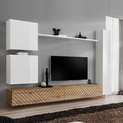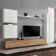 Informations Techniques : Dimensions : L. 280 x l. 40 x H. 180 cm (selon positionnement souhaité) Meuble TV : L. 120 x l. 40 x H. 30 cm Vitrine : L. 60 x l. 30 x H. 60 cm Armoire : L. 30 x l. 30 x H. 180 cm Étagère : L. 180 x l. 20 x H. 1,8 cm Matière : MDF Cet ensemble contient : 2 x Meuble TV 2 x