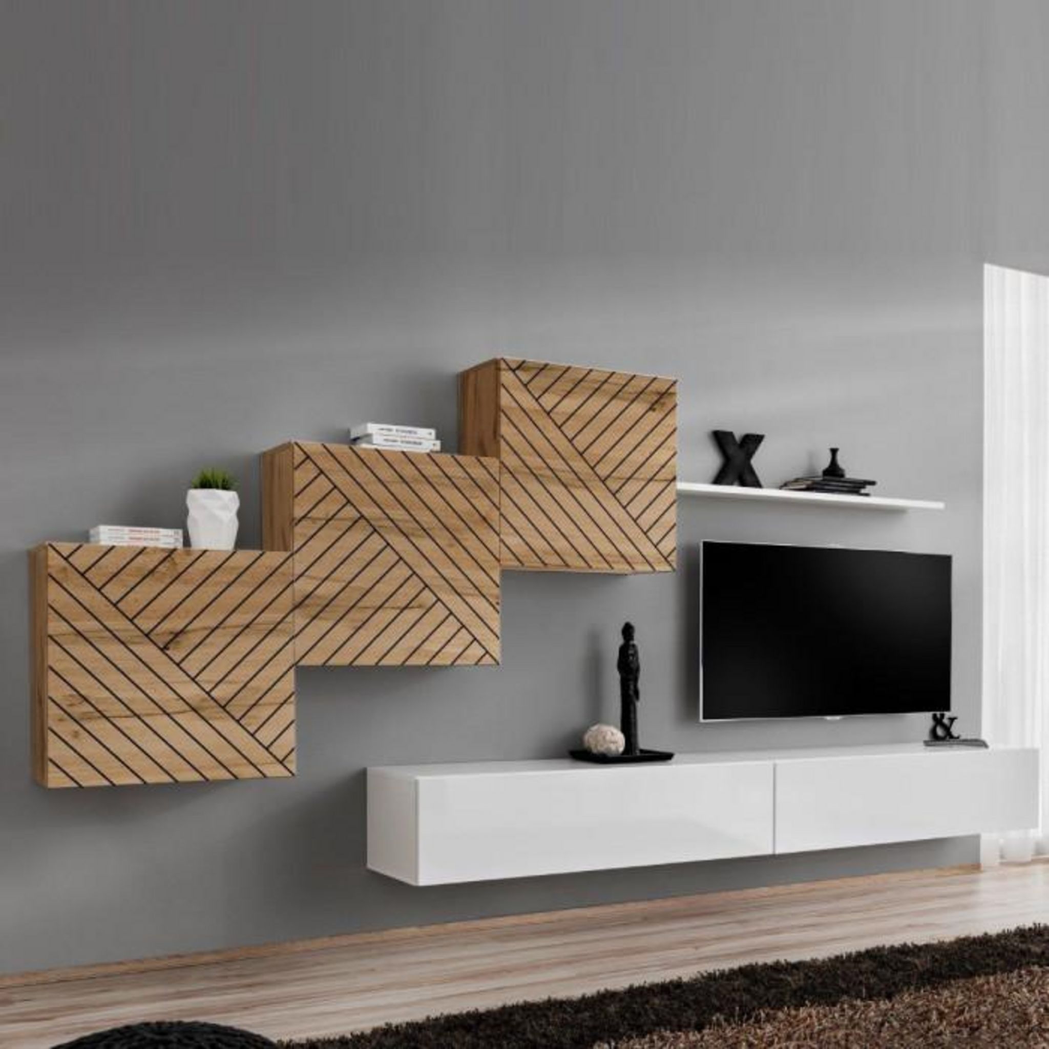 Informations Techniques : Dimensions : L. 330 x l. 40 x H. 150 cm (selon positionnement souhaité) Meuble TV : L. 120 x l. 40 x H. 30 cm Bloc mural : L. 60 x l. 30 x H. 60 cm Etagère murale : L. 120 x l. 20 x H. 1,8 cm Matière : MDF Cet ensemble contient : 2 x Meuble TV 3 x Bloc mural 1 x É