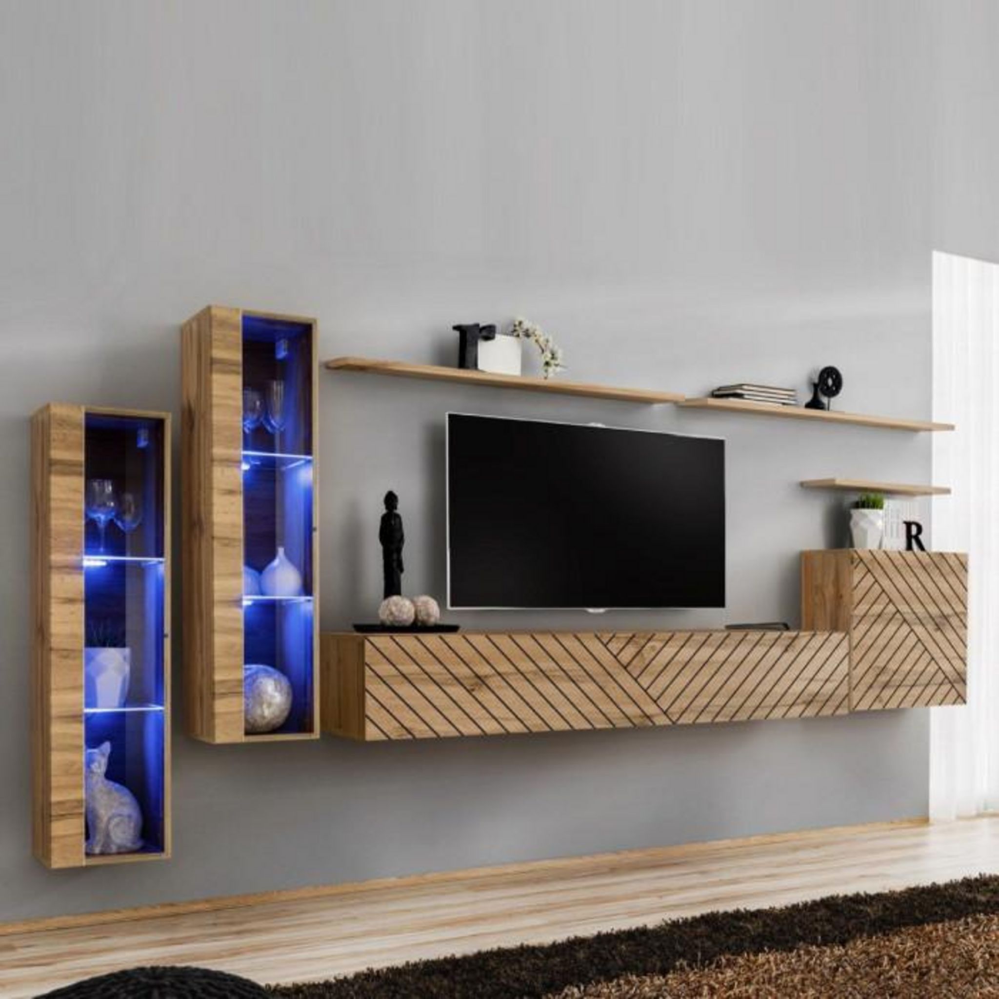 Informations Techniques : Dimensions : L. 330 x l. 40 x H. 160 cm (selon positionnement souhaité) Meuble TV : L. 180 x l. 40 x H. 30 cm Vitrine : L. 30 x l. 120 x H. 30 cm Bloc mural : L. 60 x l. 30 x H. 60 cm Etagère murale x 2 : L. 120 x l. 20 x H. 1,8 cm Etagère murale x 1 : L. 60 x l. 20 x H. 1,