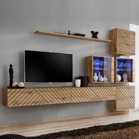 Informations Techniques : Dimensions : L. 310 x l. 40 x H. 200 cm (selon positionnement souhaité) Meuble TV : L. 120 x l. 40 x H. 30 cm Vitrine : L. 60 x l. 30 x H. 60 cm Bloc mural : L. 60 x l. 30 x H. 60 cm Étagère : L. 180 x l. 20 x H. 1,8 cm Matière : MDF Cet ensemble contient : 2 x Meuble TV 2