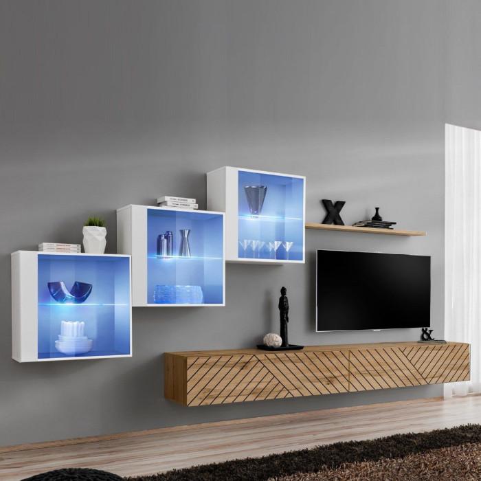 Informations Techniques : Dimensions : L. 330 x l. 40 x H. 150 cm (selon positionnement souhaité) Meuble TV : L. 120 x l. 40 x H. 30 cm Vitrine : L. 60 x l. 30 x H. 60 cm Étagère : L. 120 x l. 20 x H. 1,8 cm Matière : MDF Cet ensemble contient : 2 x Meuble TV 3 x Vitrine murale à LED 1 x Étagère Sp