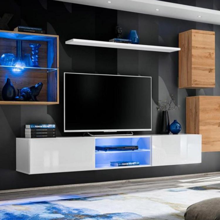 Informations Techniques : Dimensions : L. 250 x l. 40 x H. 140 cm (selon positionnement souhaité) Vitrine : L. 60 x l. 30 x H. 60 cm Étagère : L. 120 x l. 20 x H. 2,2 cm Bloc Mural : L. 30 x l. 25 x H. 60 cm Meuble TV : L. 180 x l. 40 x H. 30 cm Matière : MDF Spécificités : Tendance & Moderne Cet e