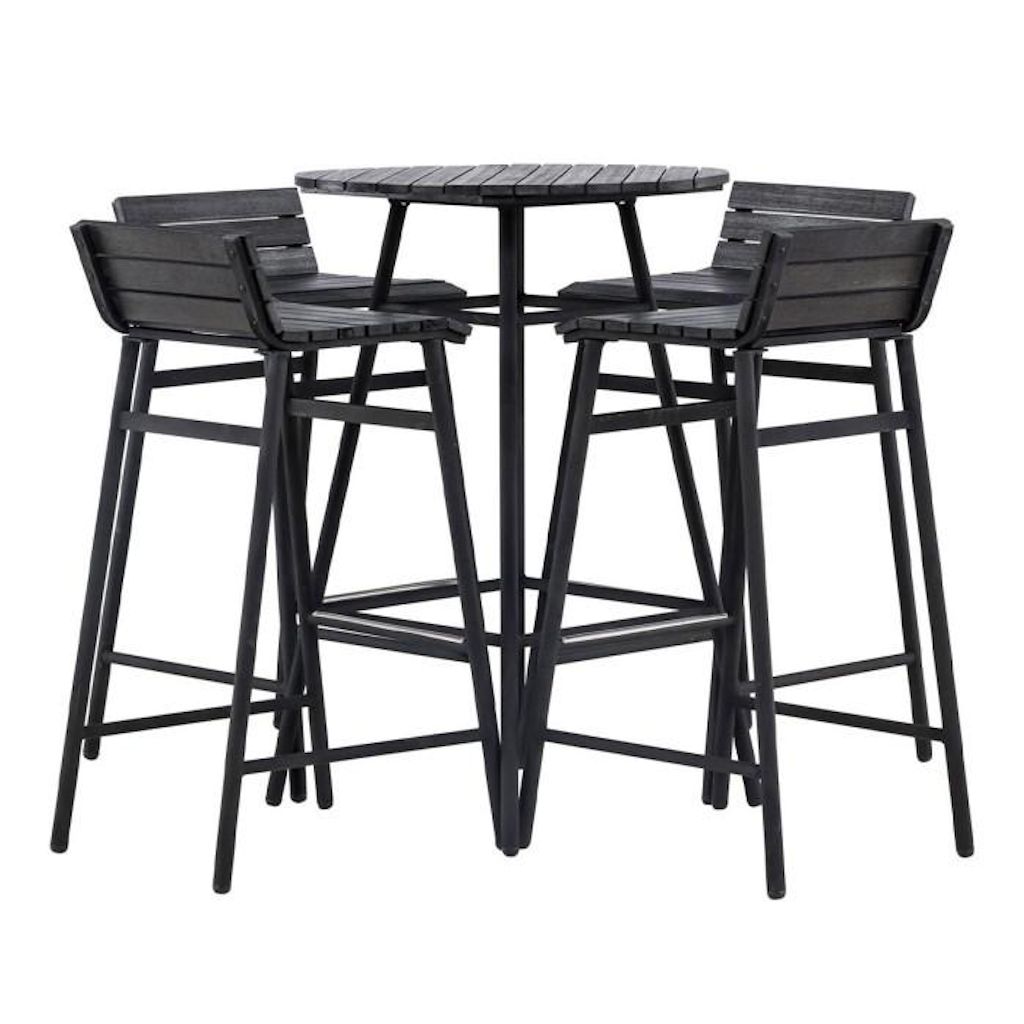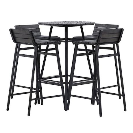 Informations Techniques : Dimensions : Table : D. 65 x H. 95 cm Tabourets : L. 44 x l. 43 x H. 91 cm Matières : Acier & Bois (Acacia) Spécificités : Minimaliste & Élégant Table de bar 4 places Avec 4 tabourets de bar Poids max supporté : Table : 45 kg Tabouret : 150 kg Couleur : Noir