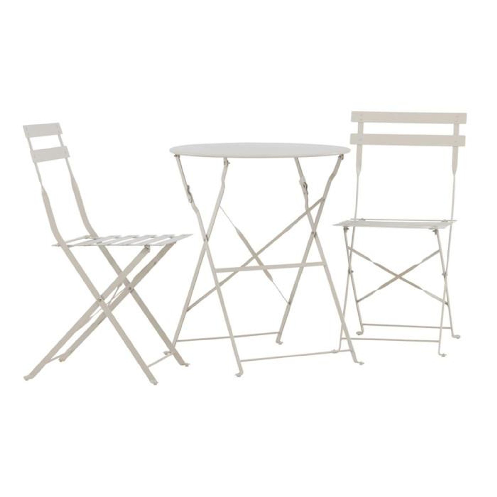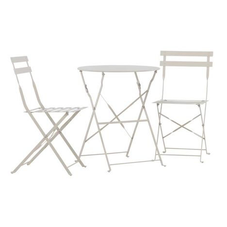 Informations Techniques : Dimensions : Table : D. 60 x H. 71 cm Chaise : L. 42 x l. 46 x H. 88 cm Matière : Acier Spécificités : Pliable & Léger Table d'extérieur carrée Avec 2 chaises Poids max supportés : Table : 30 kg Chaise : 110 kg (à l'unité) Couleur : Beige