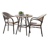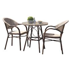 Informations Techniques : Dimensions : Table : D. 70 x H. 74 cm Fauteuil : L. 56 x l. 60 x H. 85 cm Assise : H. 46,5 cm Accoudoirs : H. 65 cm Matières : Aluminium & Textilène Spécificités : Pratique & Tendance Table d'extérieur ronde Avec 2 fauteuils empilables Nombre de colis : 3 Poids : 14,5 kg C