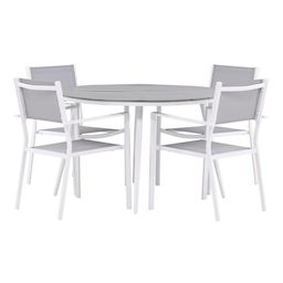 Informations Techniques : Dimensions : Table : D. 120 x H. 74 cm Chaise : L. 57 x l. 61 x H. 88 cm Assise : L. 41 x l. 50 x H. 42 cm Accoudoirs : l. 3,8 x H. 65,5 cm Plateau : H. 3,7 cm Matières : Table : Aluminium & Polystyrène Chaise : Aluminium & Textilène Spécificités : Élégant & Moderne Table