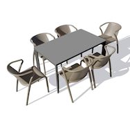 Informations Techniques : Dimensions : Table : L. 160 x l. 90 x H. 73 cm Fauteuil : L. 56 x l. 52 x H. 76 cm Matières : Aluminium & Polypropylène Spécificités : Robuste & Durable Table d'extérieur Avec 6 fauteuils empilables Plateau stratifié Structure laquée À monter soi-même Nombre de colis : 2 P