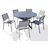 Informations Techniques : Dimensions : L. 145-199 x l. 145 x H. 75 cm Chaise : L. 48 x l. 59 x H. 84 cm Assise : L. 42 x l. 43 x H. 46 cm Dossier : l. 47,5 x H. 34 cm Matières : Aluminium & Textilène Spécificités : Pratique & Utile Table d'extérieur extensible Avec 6 chaises empilables Rallonge papi