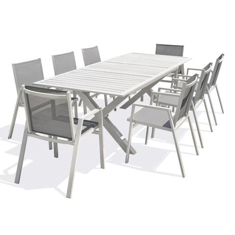 Informations Techniques : Dimensions : Table : L. 180-240 x l. 100 x H. 77 cm Fauteuil : L. 60 x l. 56 x H. 86 cm Accoudoirs : H. 61 cm Matières : Aluminium & Textilène Spécificités : Pratique & Utile Ensemble table d'extérieur extensible Avec 8 fauteuils empilables Rallonge automatique Piètement c