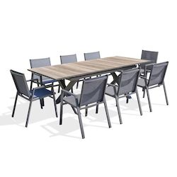 Informations Techniques : Dimensions : Table : L. 180-240 x l. 100 x H. 77 cm Fauteuil : L. 60 x l. 56 x H. 86 cm Accoudoirs : H. 61 cm Matières : Aluminium, HPL & Textilène Spécificités : Pratique & Utile Ensemble table d'extérieur extensible Avec 8 fauteuils empilables Plateau imitation bois Rall