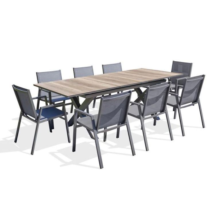 Ensemble Table de Jardin Extensible Imitation Bois & 8 Fauteuils Floride 180-240cm Gris Anthracite