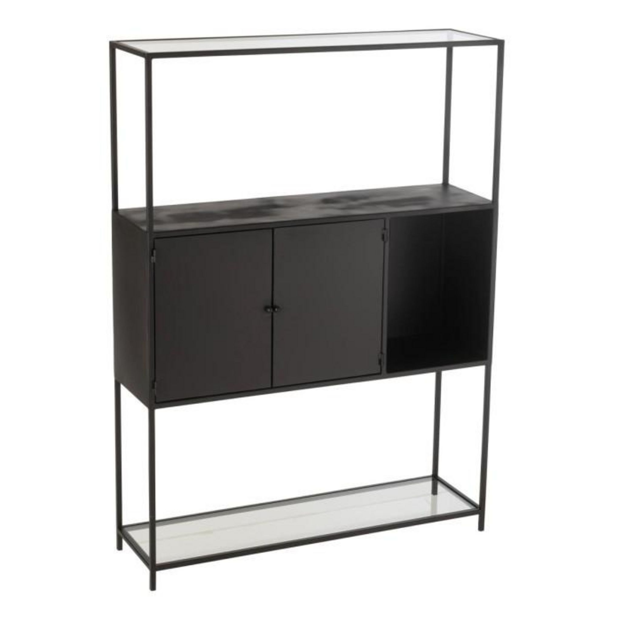 Informations Techniques : Dimensions : L. 90 x l. 26 x H. 126 cm Matières : 90% Métal & 10% Verre Spécificités : Moderne & Utile Étagère 2 portes Forme rectangulaire Poids max supporté : 20 kg Poids : 21,5 kg Couleur : Noir