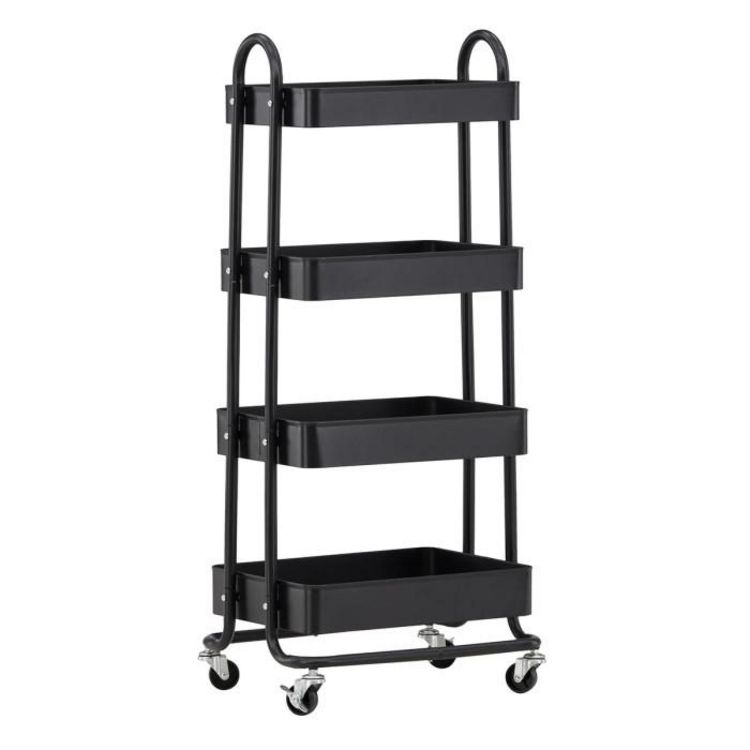 Informations Techniques : Dimensions : L. 46 x l. 34 x H. 104 cm Matière : Acier Spécificités : Pratique & Moderne Étagère 4 niveaux Avec roulettes Revêtement en poudre époxy Nombre de colis : 1 Poids max supporté : 20 kg Poids : 5 kg Couleur : Noir