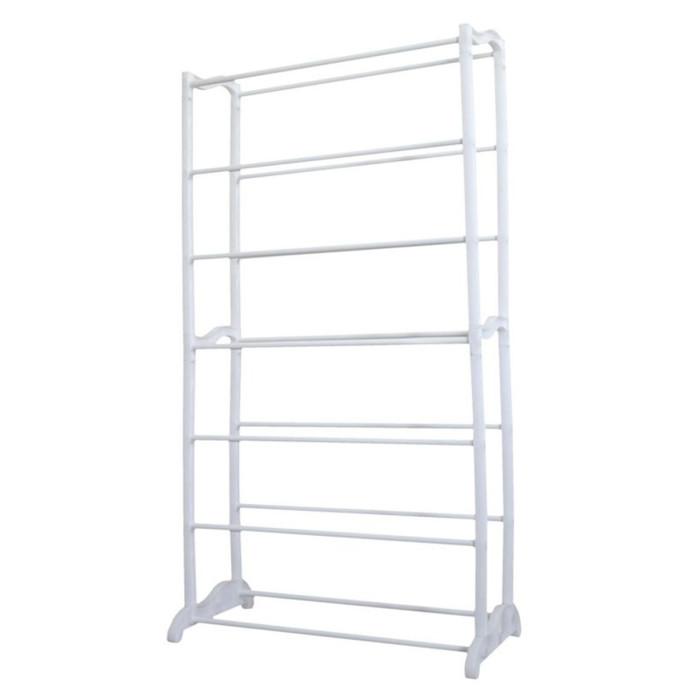 Informations Techniques : Dimensions : L. 50 x l. 16,5 x H. 96 cm Matières : Polypropylène, Métal & Fer Spécificités : Tendance & Design Étagère à Chaussures 21 Paires 7 Étages A monter soi-même Notice de Montage incluse Poids : 1,2 kg Couleur : Blanc