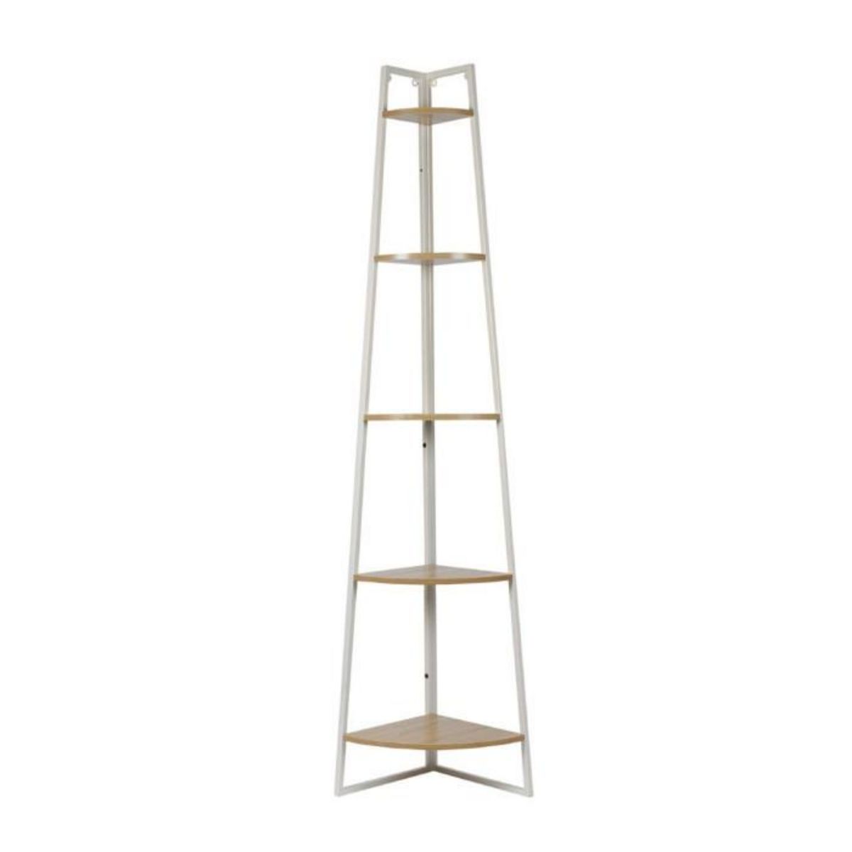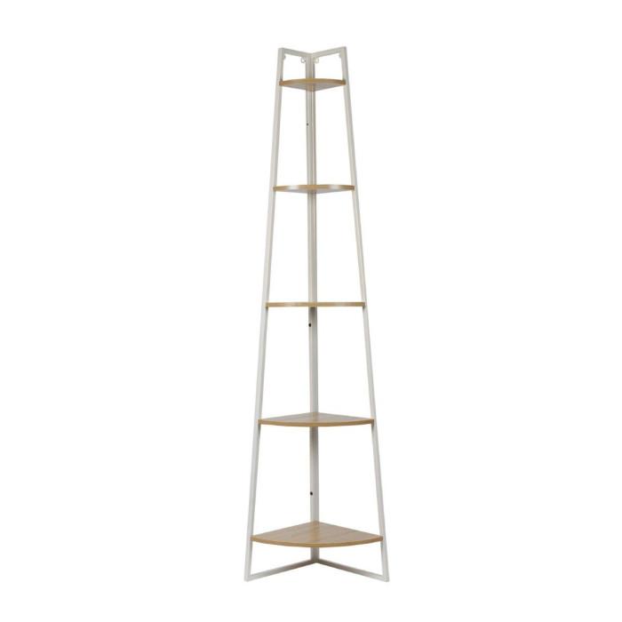 Informations Techniques : Dimensions : L. 34 x l. 34 x H. 180 cm Matières : Structure : Métal Plateaux : Panneaux de particules Spécificités : Pratique & Utile Étagère d'angle Avec 5 niveaux A monter soi-même (10 minutes) Poids : 5 kg Couleur : Blanc