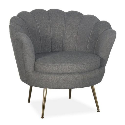 Informations Techniques : Dimensions : L. 80,5 x l. 79 x H. 78,5 cm Matières : Revêtement : Tissu Structure : Bois Piètement : Métal Spécificités : Glamour & Tendance Fauteuil boudoir Design coquillage Tissu bouclette Dossier courbé Style moderne Poids : 15 kg Couleur : Gris