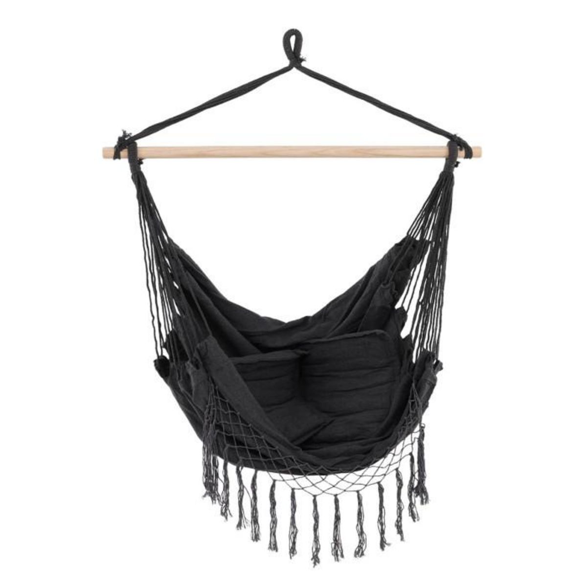 Informations Techniques : Dimensions : L. 100 x l. 50 x H. 120 cm Matières : Polyester & Coton Spécificités : Confortable & Moderne Fauteuil suspendu avec franges Bâton en bois décoratif Coussin inclus Poids max supporté : 120 kg Poids : 1,7 kg Couleur : Gris