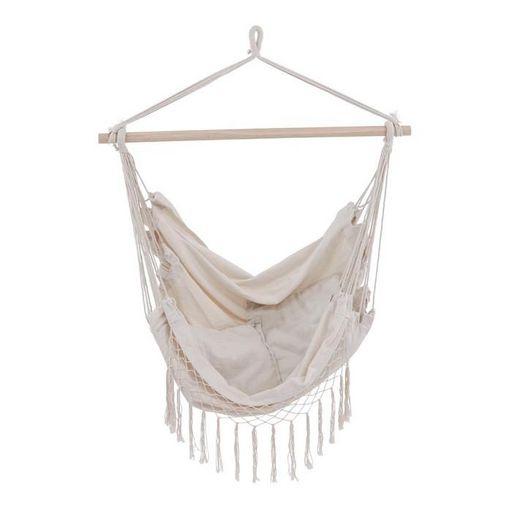 Informations Techniques : Dimensions : L. 100 x l. 50 x H. 120 cm Matières : Polyester & Coton Spécificités : Confortable & Moderne Fauteuil suspendu avec franges Bâton en bois décoratif Coussin inclus Poids max supporté : 120 kg Poids : 1,7 kg Couleur : Naturel