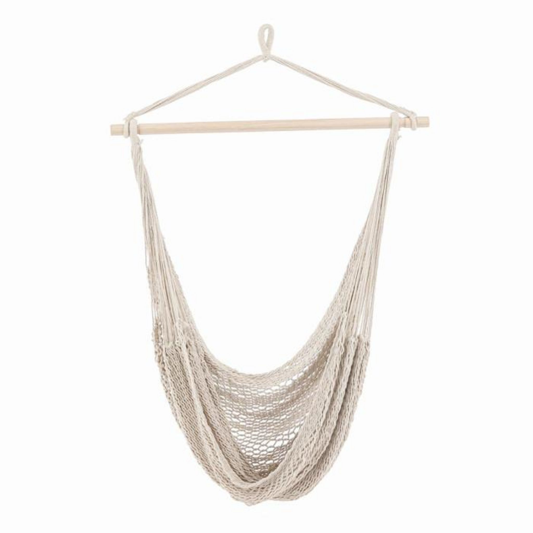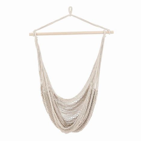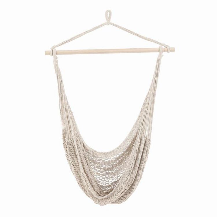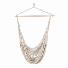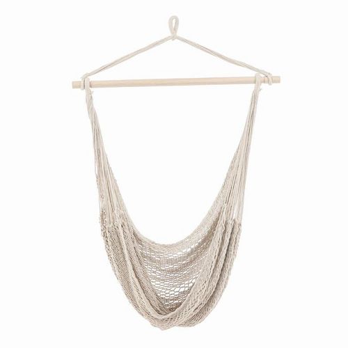 Informations Techniques : Dimensions : L. 110 x l. 34 x H. 135 cm Matières : Polyester & Coton Spécificités : Tendance & Confortable Fauteuil suspendu Avec bâton en bois Poids max supporté : 120 kg Poids : 1,7 kg Couleur : Naturel
