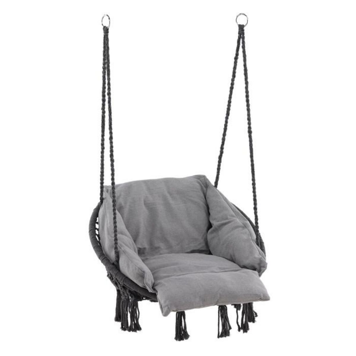 Informations Techniques : Dimensions : L. 80 x l. 60 x H. 90 cm Assise : L. 60 x l. 45 cm Matière : Polyester Spécificités : Confortable & Moderne Fauteuil suspendu Coussin moelleux inclus Poids max supporté : 120 kg Poids : 5 kg Couleur : Gris