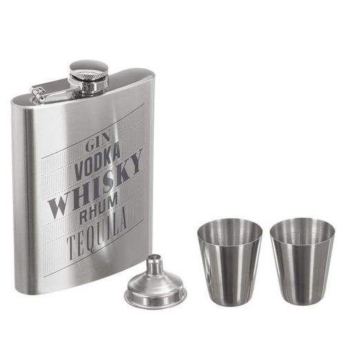 Informations Techniques : Dimensions : L. 9,5 x l. 2,2 x H. 13,5 cm Matières : Métal & Acier inoxydable Spécificités : Pratique & Utile Fiole à Whisky Contient 2 shooters & 1 entonnoir Facile d'entretien & d'utilisation Couleur : Argent