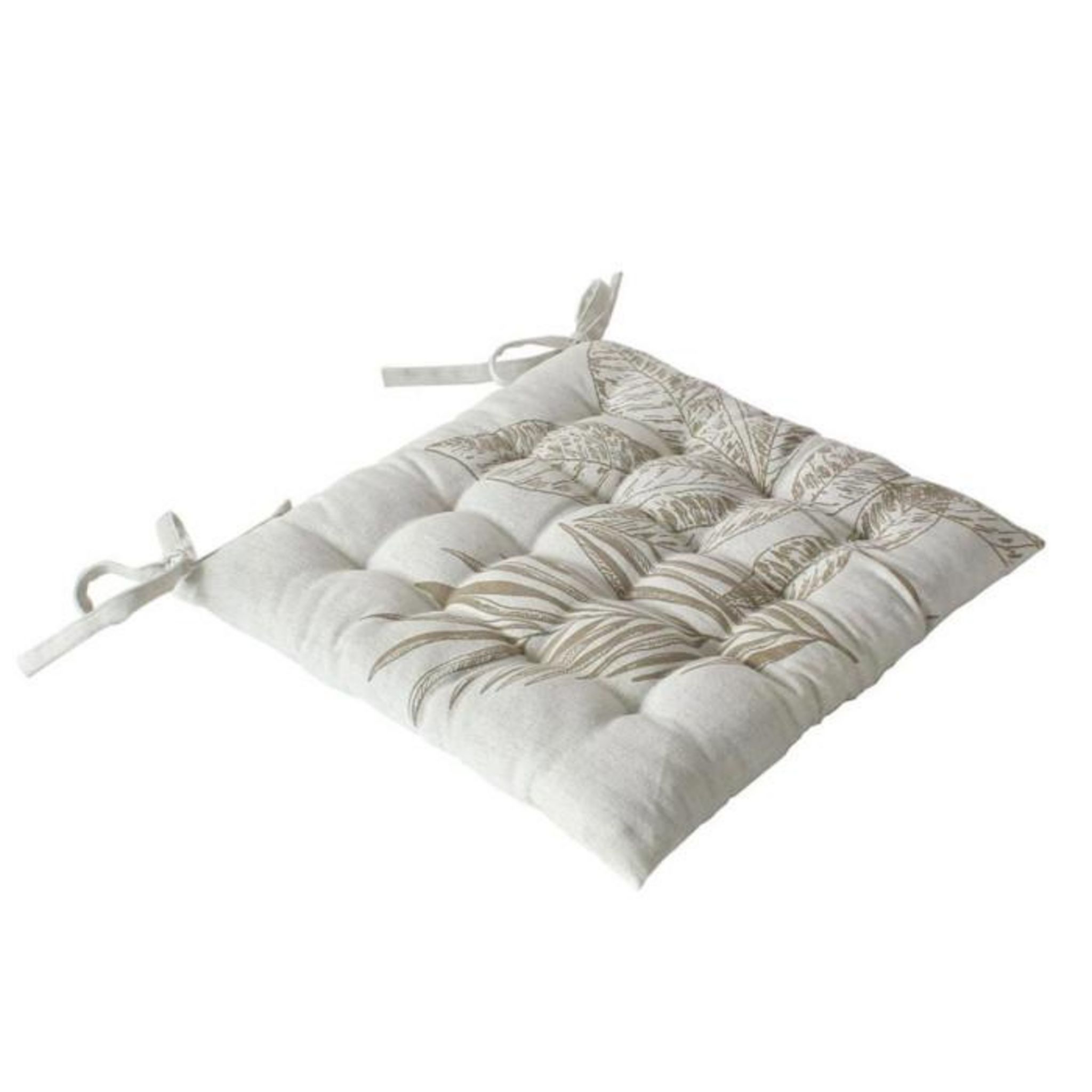 Informations Techniques : Dimensions : L. 38 x l. 38 cm Matières : 80% Coton Recyclé & 20% Polyester Garnissage : 100% Polyester Spécificités : Pratique & Confort Coussin de chaise matelassé Imprimé feuilles tropicales Avec 4 nouettes Recto imprimé Verso uni Couleur : Écru