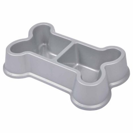 Informations Techniques : Dimensions : L. 35 x l. 23 x H. 7 cm Matière : Plastique Spécificités : Pratique & Efficace Gamelle Double Pour Chiens Forme Os Couleur : Argent