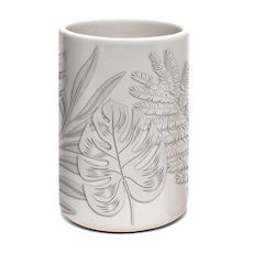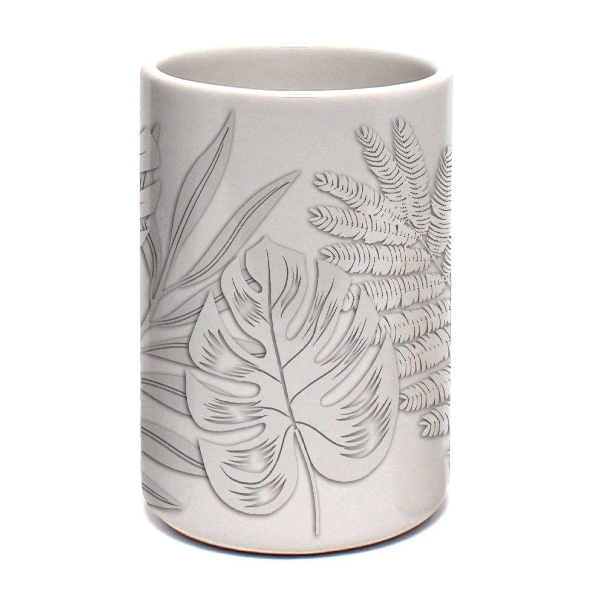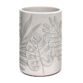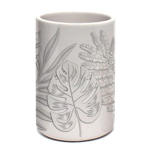 Informations Techniques : Dimensions : D. 7 x H. 10,7 cm Matière : Céramique Spécificités : Pratique & Élégant Gobelet brosse à dent Motif imprimé feuilles Forme ronde Vendu à l'unité Poids : 0,26 kg Couleur : Gris