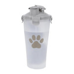 Informations Techniques : Dimensions : L. 10,5 x l. 7 x H. 22 cm Matière : Plastique Spécificités : Pratique & Utile Gourde pour Chien 2 en 1 Double réservoir (2 x 350 ml) Pour eau et croquettes Motif patte de chien Contenance : 700 ml Poids : 0,25 kg Couleur : Gris