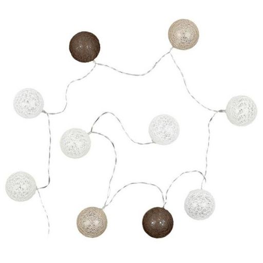 Informations Techniques : Dimensions : L. 175 x D. 6 cm Boule : D. 6 cm Matière : Plastique Spécificités : Tendance & Moderne Guirlande Lumineuse à Led Fonctionne avec 2 piles AA LR6 (non incluses) Nombre de LED : 10 Facile d'Utilisation Couleur : Marron, Beige & Blanc