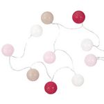 Informations Techniques : Dimensions : L. 175 x D. 6 cm Boule : D. 6 cm Matière : Plastique Spécificités : Tendance & Moderne Guirlande Lumineuse à Led Fonctionne avec 2 piles AA LR6 (non incluses) Nombre de LED : 10 Facile d'Utilisation Couleur : Rose, Beige, Framboise & Blanc