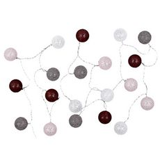 Informations Techniques : Dimensions : L. 372 x l. 5,5 x H. 5,5 cm Boule : D. 5,5 cm Matière : Plastique Spécificités : Tendance & Moderne Guirlande Lumineuse à Led Fonctionne avec 2 piles AA LR06 (non incluses) Nombre de LED : 20 Facile d'Utilisation Couleur : Bordeaux, Blanc & Rose