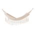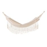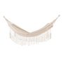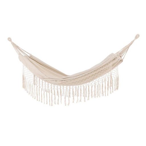 Informations Techniques : Dimensions : L. 200 x l. 150 x H. 2 cm Matières : Polyester & Coton Spécificités : Confortable & Durable Hamac en tissu Franges décoratives Poids max supporté : 120 kg Poids : 1,6 kg Couleur : Naturel