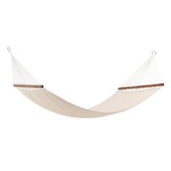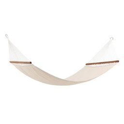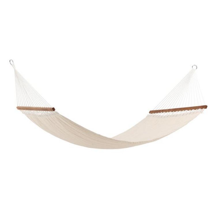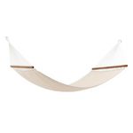 Informations Techniques : Dimensions : L. 200 x l. 140 cm Matières : Polyester & Bois (Acacia) Spécificités : Confortable & Durable Hamac en tissu Suspension flexible Poids max supporté : 200 kg Poids : 6 kg Couleur : Naturel