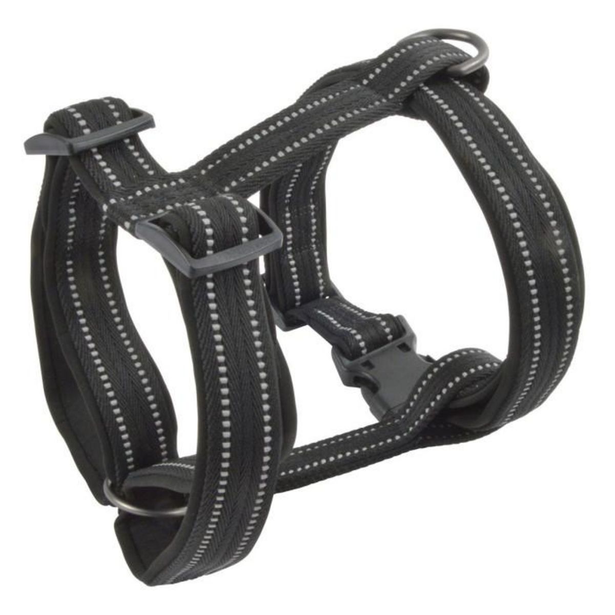 Informations Techniques : Dimensions : Poitrine : L. 90-107 x l. 4 cm Cou : L. 55-95 cm Matières : Nylon & Noéprène Spécificités : Ajustable & Résistant Harnais pour grand chien Détails réfléchissants Doublure en néoprène Taille XL Poids : 0,35 kg Couleur : Noir