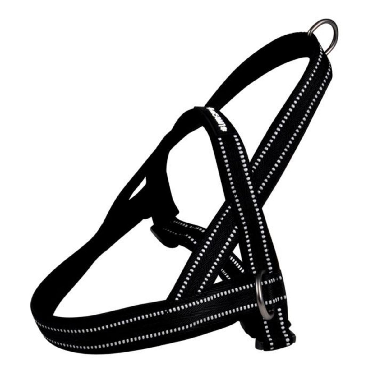 Informations Techniques : Dimensions : L. 75-95 cm Tour de cou : 66 cm Matières : Nylon & Néoprène Spécificités : Résistant & Réfléchissant Harnais Norvégien Réglable Pour Animaux Taille L Poids : 0,29 kg Couleur : Noir