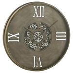 Informations Techniques : Dimensions : L. 80 x l. 9,5 x H. 80 cm Matière : Métal Spécificités : Pratique & Utile Horloge Murale Forme Ronde 4 Chiffres Romains Design Engrenage Style Vintage & Rétro Poids : 3,8 kg Couleur : Cuivre