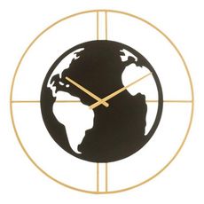 Informations Techniques : Dimensions : D. 60 x H. 4 cm Matières : 95% Métal & 5% plastique Spécificités : Déco & Chic Horloge murale Carte du monde Forme ronde Poids : 1 kg Couleur : Noir & Or