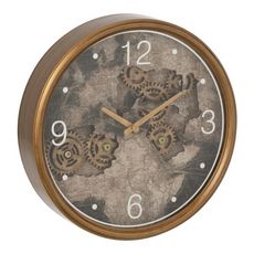 Informations Techniques : Dimensions : L. 39 x l. 9 x H. 39 cm Matières : 50% MDF, 30% Verre & 20% Métal Spécificités : Vintage & Utile Horloge murale ronde Design carte d'Europe Avec engrenages Poids : 2,78 kg Couleur : Or