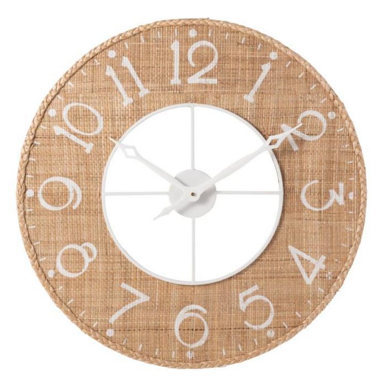 Informations Techniques : Dimensions : L. 60 x l. 6 x H. 60 cm Matières : 70% MDF, 20% Métal & 10% Roseau Spécificités : Déco & Tendance Horloge murale ronde Chiffres analogiques Design bicolore Fonctionne à pile Pile non incluse Poids : 1,9 kg Couleur : Blanc & Naturel