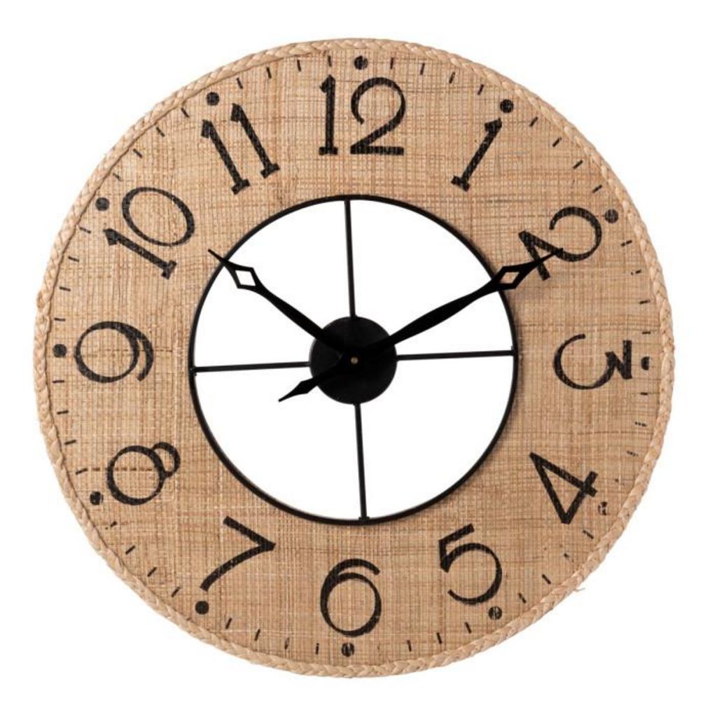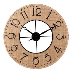 Informations Techniques : Dimensions : L. 60 x l. 6 x H. 60 cm Matières : 70% MDF, 20% Métal & 10% Roseau Spécificités : Déco & Tendance Horloge murale ronde Chiffres analogiques Design bicolore Fonctionne à pile Pile non incluse Poids : 1,9 kg Couleur : Noir & Naturel