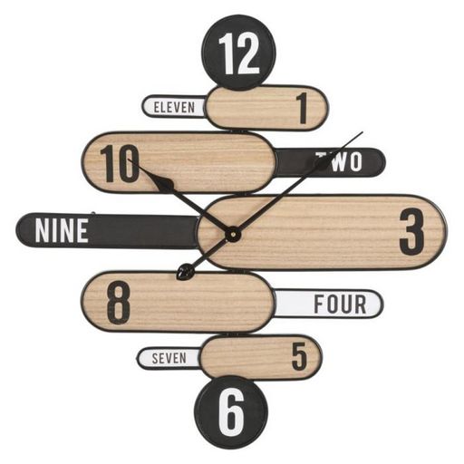 Informations Techniques : Dimensions : L. 60 x l. 5 x H. 60 cm Matières : Métal & MDF Spécificités : Originale & Utile Horloge murale Design direction Chiffres analogiques Poids : 1,44 kg Couleur : Naturel & Noir