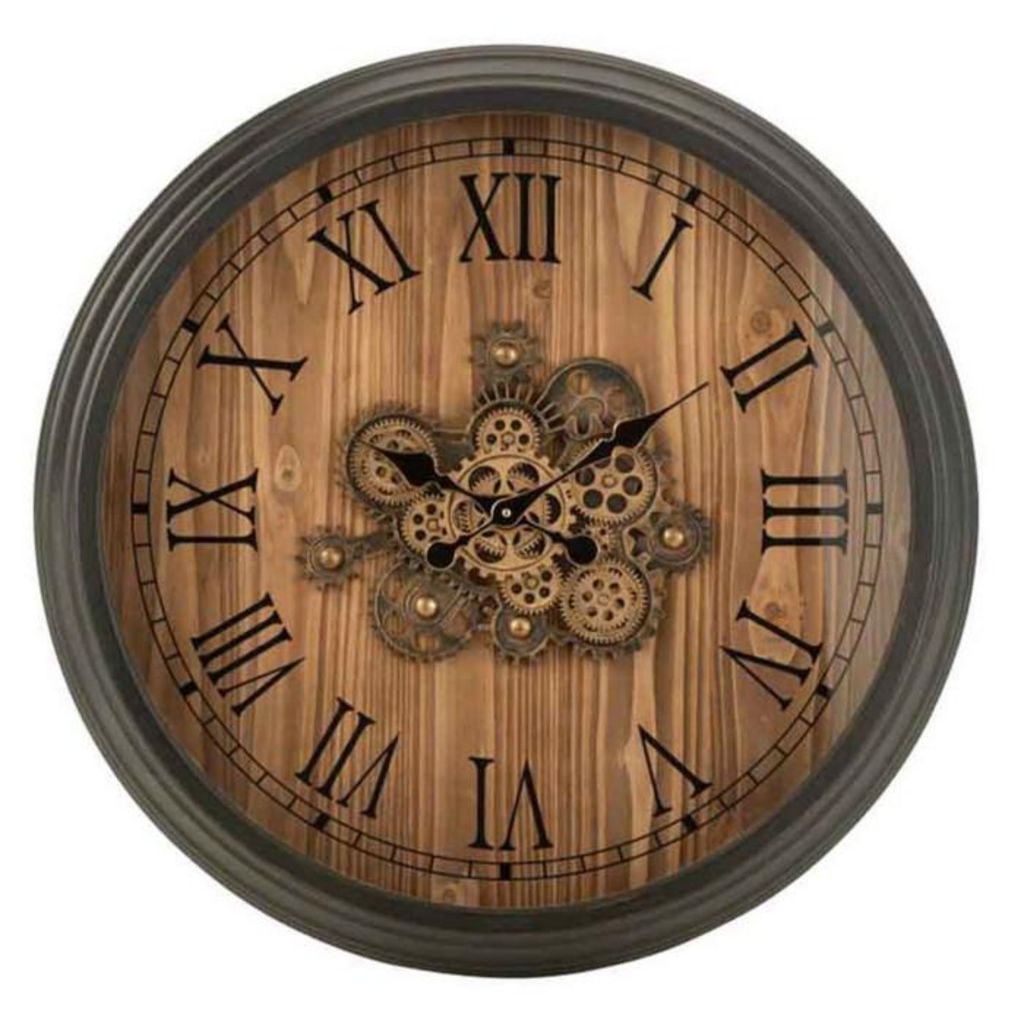 Informations Techniques : Dimensions : L. 82 x l. 9 x H. 82 cm Matière : Métal Spécificités : Pratique & Utile Horloge Murale Forme Ronde Chiffres Romains Design Engrenage Style Vintage & Rétro Poids : 8,6 kg Couleur : Noir & Marron