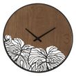 Informations Techniques : Dimensions : L. 60 x l. 2 x H. 60 cm Matières : Métal & MDF Spécificités : Déco & Utile Horloge murale ronde Design feuilles ajourées Chiffres analogiques Pile non incluse Type de pile : 1 x AA Poids : 1,45 kg Couleur : Marron & Noir