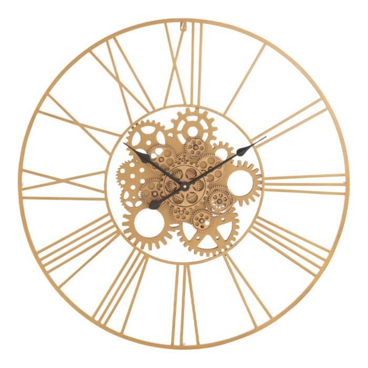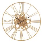 Informations Techniques : Dimensions : L. 80 x l. 6,5 x H. 80 cm Matière : Métal Spécificités : Pratique & Utile Horloge Murale Design Forme Ronde Chiffres Romains Design Engrenage Poids : 2,9 kg Couleur : Or