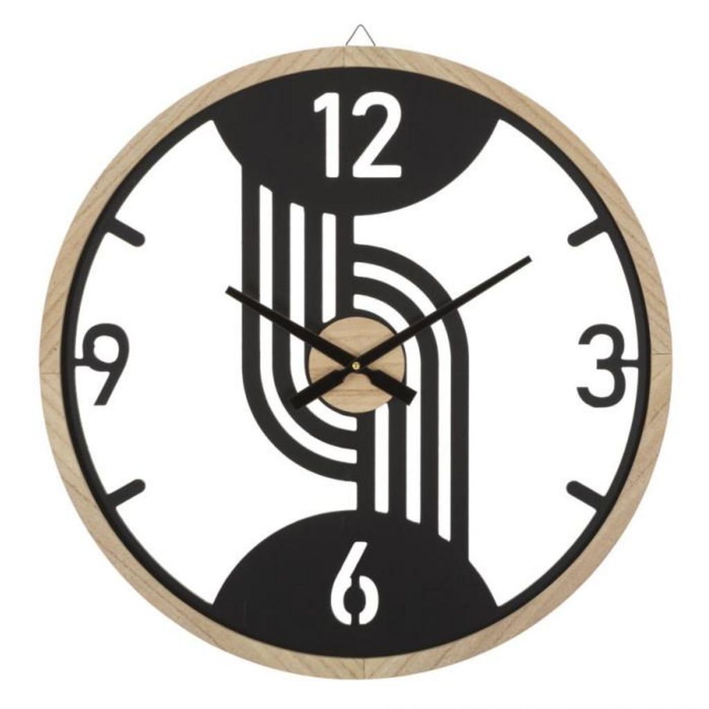 Informations Techniques : Dimensions : L. 60 x l. 2,5 x H. 60 cm Matières : Métal & MDF Spécificités : Déco & Utile Horloge murale ronde Design géométrique Chiffres analogiques Pile non incluse Type de pile : 1 x AA Poids : 1,2 kg Couleur : Noir & Naturel